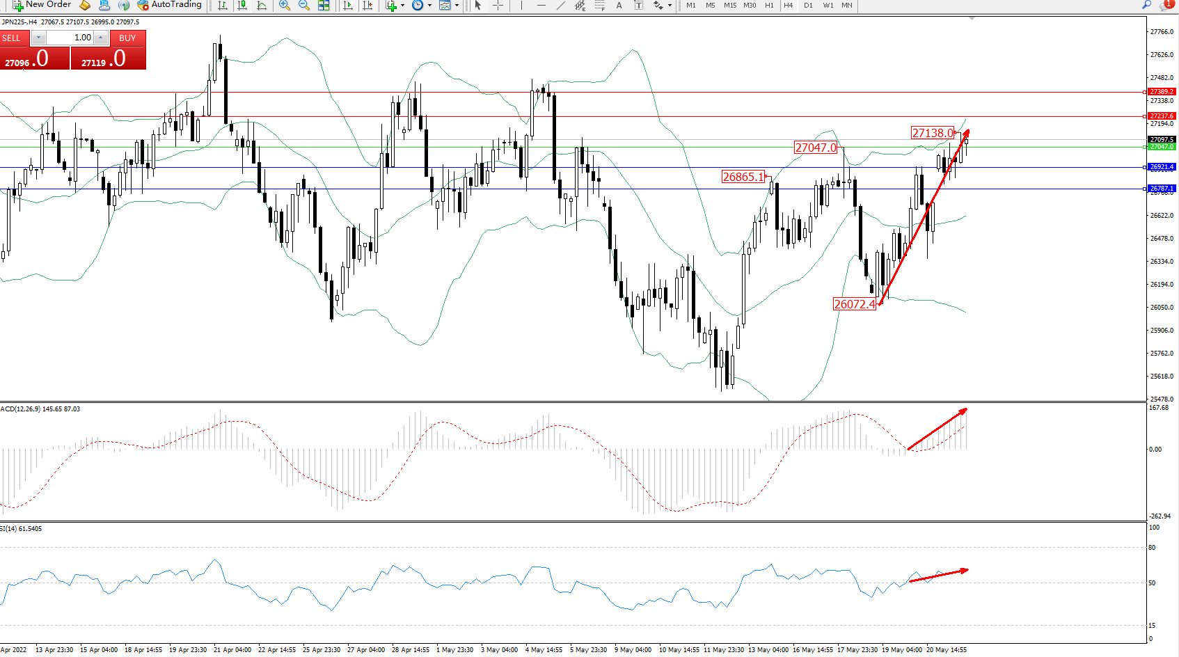技术点评:多头动力强势震荡上移,触及布林带指标上轨至27138附近节点后有继续攀升态势,布林带指标呈张口走势持续中,短期向上移动走势持续,MACD指标处于0轴线上方多头区域维持震荡不断上移中,RSI指标处于50均衡线上側维持整理缓慢上行;