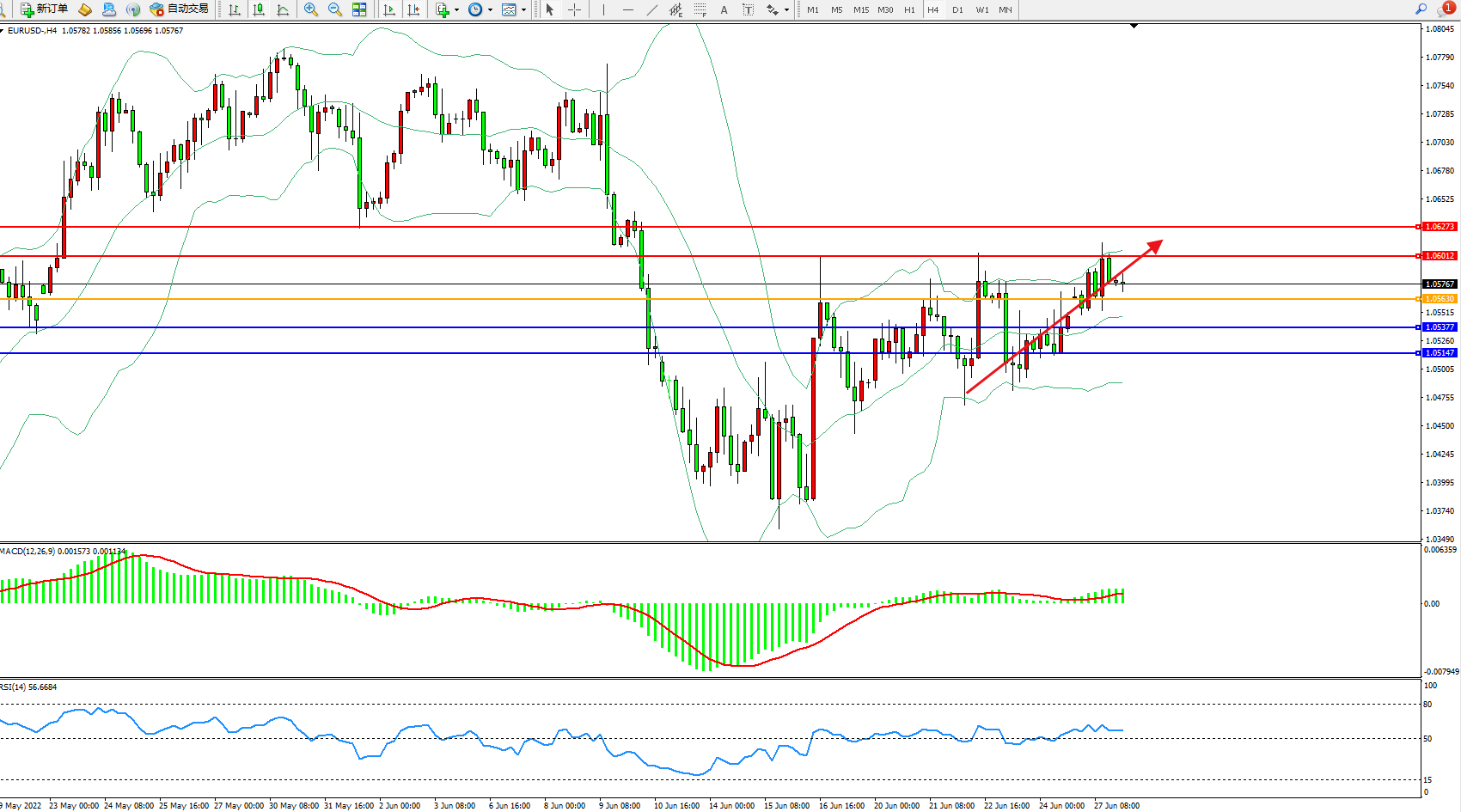 4小时图看:多头动力延续布林带指标通道中上轨区间持续震荡上扬,短期多头动力有继续向上移动迹象,布林带指标呈缓慢张口走势中,MACD指标处于0轴线上側徘徊,RSI指标处于50均衡线上側整理;