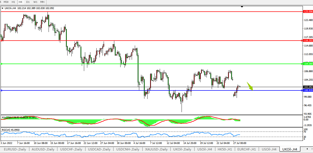 4小时图看:短线价格小幅反弹但后续乏力,中期图形结构依旧偏弱,且趋势线破败, MACD量能柱0轴下小幅缩量,RSI小幅反弹,短期油价反弹后下行概率较大。