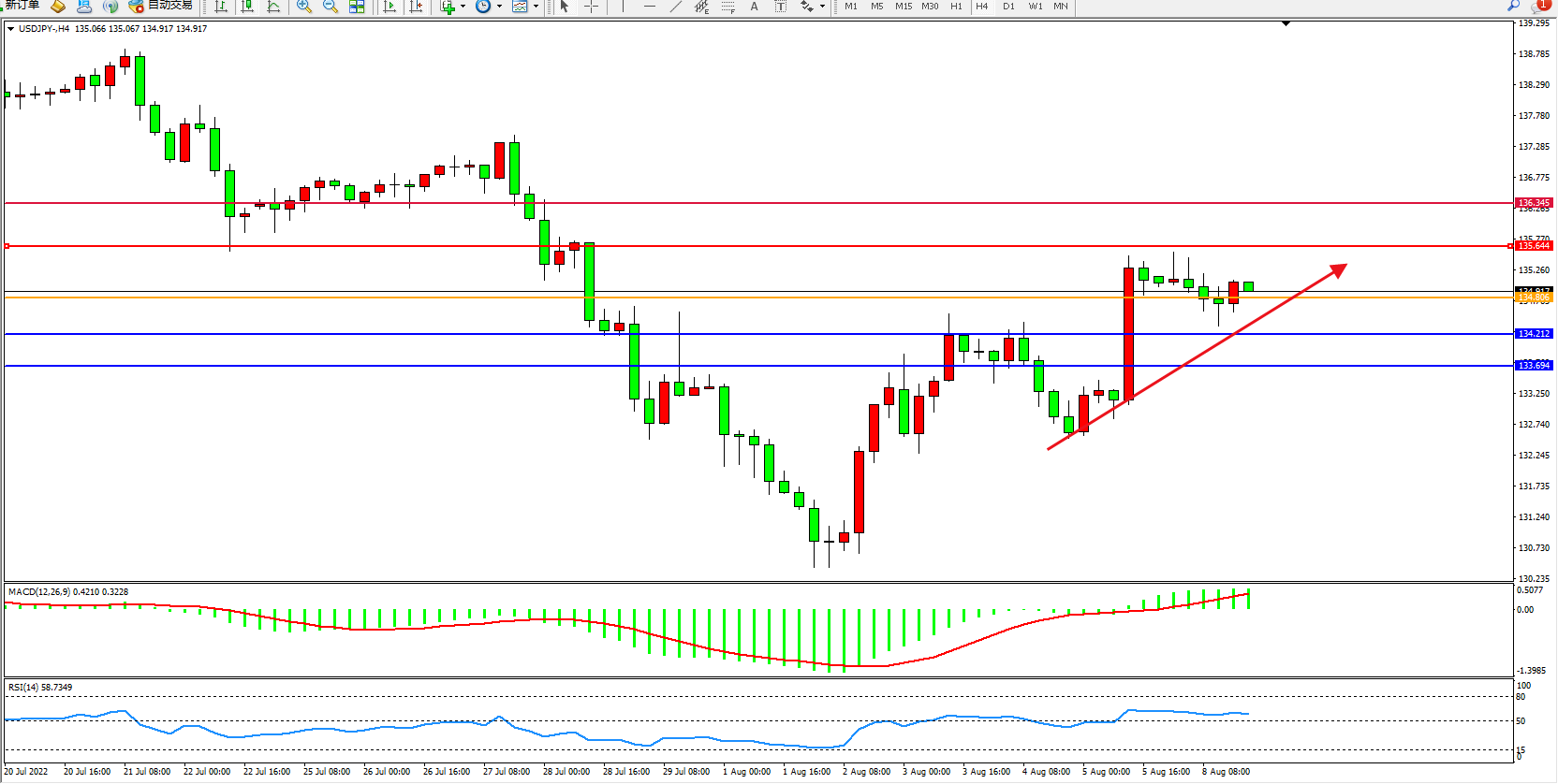 4小时图看:低位多头动力维持震荡上移,短期纠结整理平移,MACD指标处于多头区域维持弱势徘徊,RSI指标处于50均衡线上側窄幅整理;