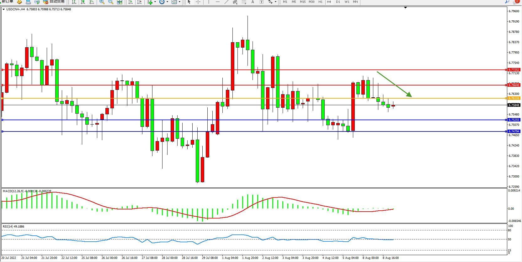 美元人民币USDCNH——4小时K线图显示: