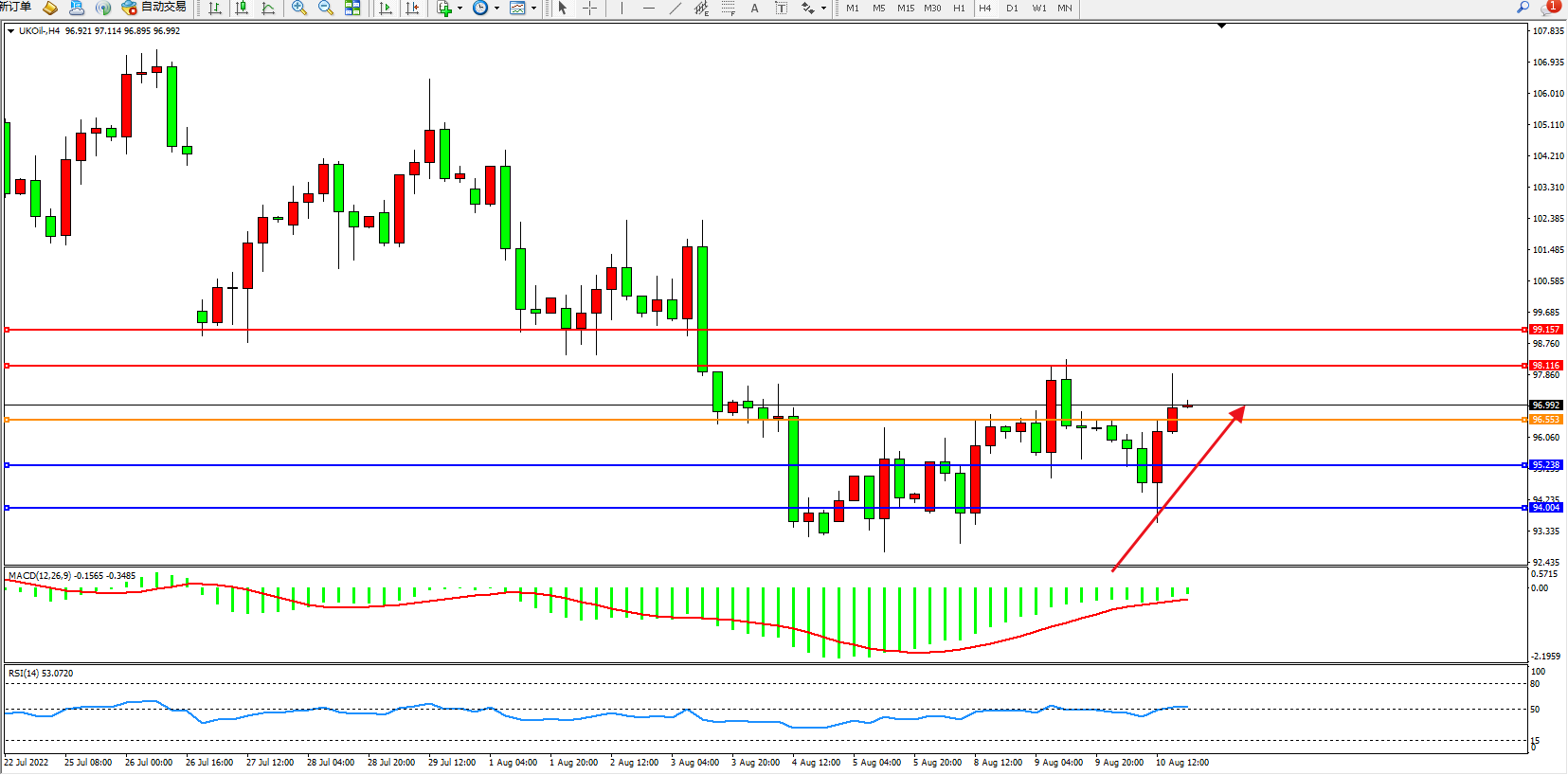 交易策略:96.553上方看涨,目标98.116、99.157