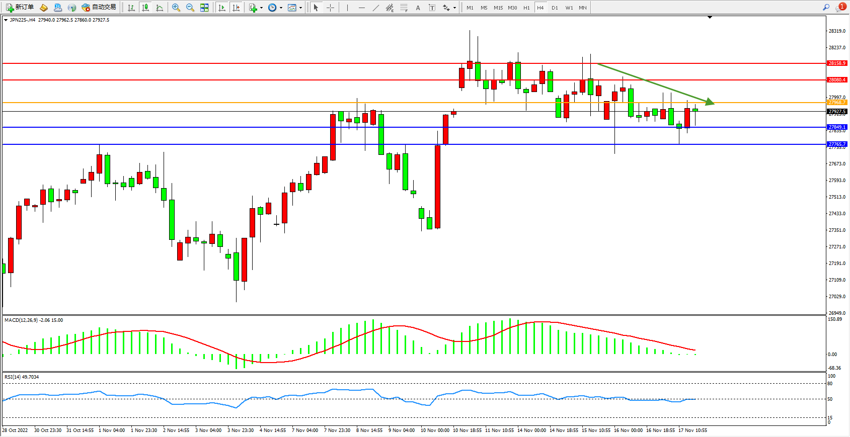 日经225指数11月17日(周四)收盘下跌90.30点,跌幅0.32%,报27938.00点。日本央行行长黑田东彦:目前的通胀是由成本推动的。日本央行将继续通过宽松政策坚定地支持经济。需要在实现伴随着工资增长的稳定的通胀。实现可持续、稳定的通胀目标是可能的,尽管这可能需要时间。
