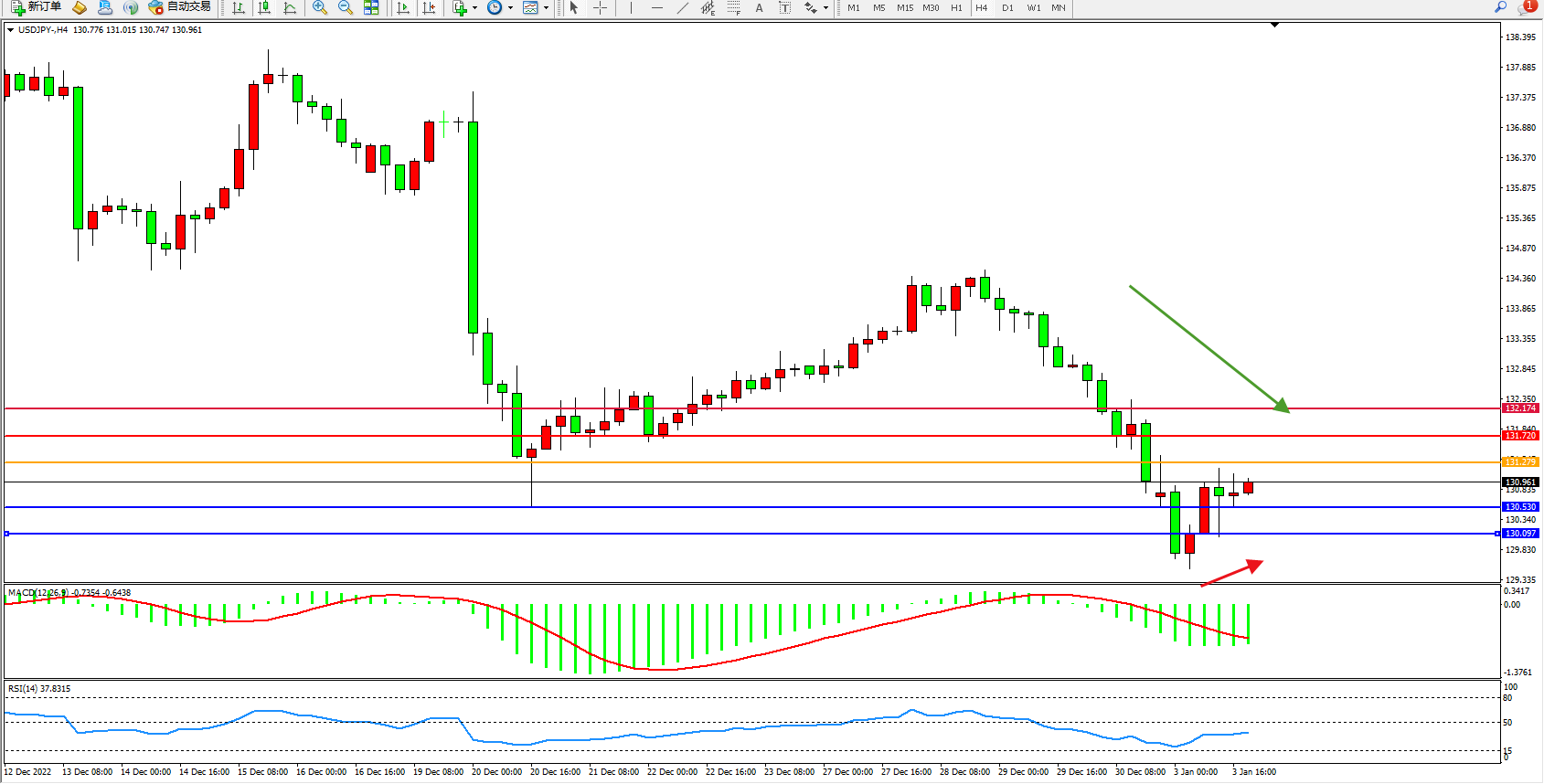 交易策略:131.2799下方看跌,目标130.530、130.097