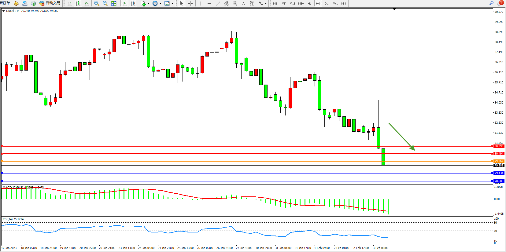 4小时图看:空头动力延续下行趋势持续下行,短期跌势未见止步,市场空头情绪持续向下移动中,MACD指标处于空头区域缓慢下行,RSI指标处于空头区域低位整理;