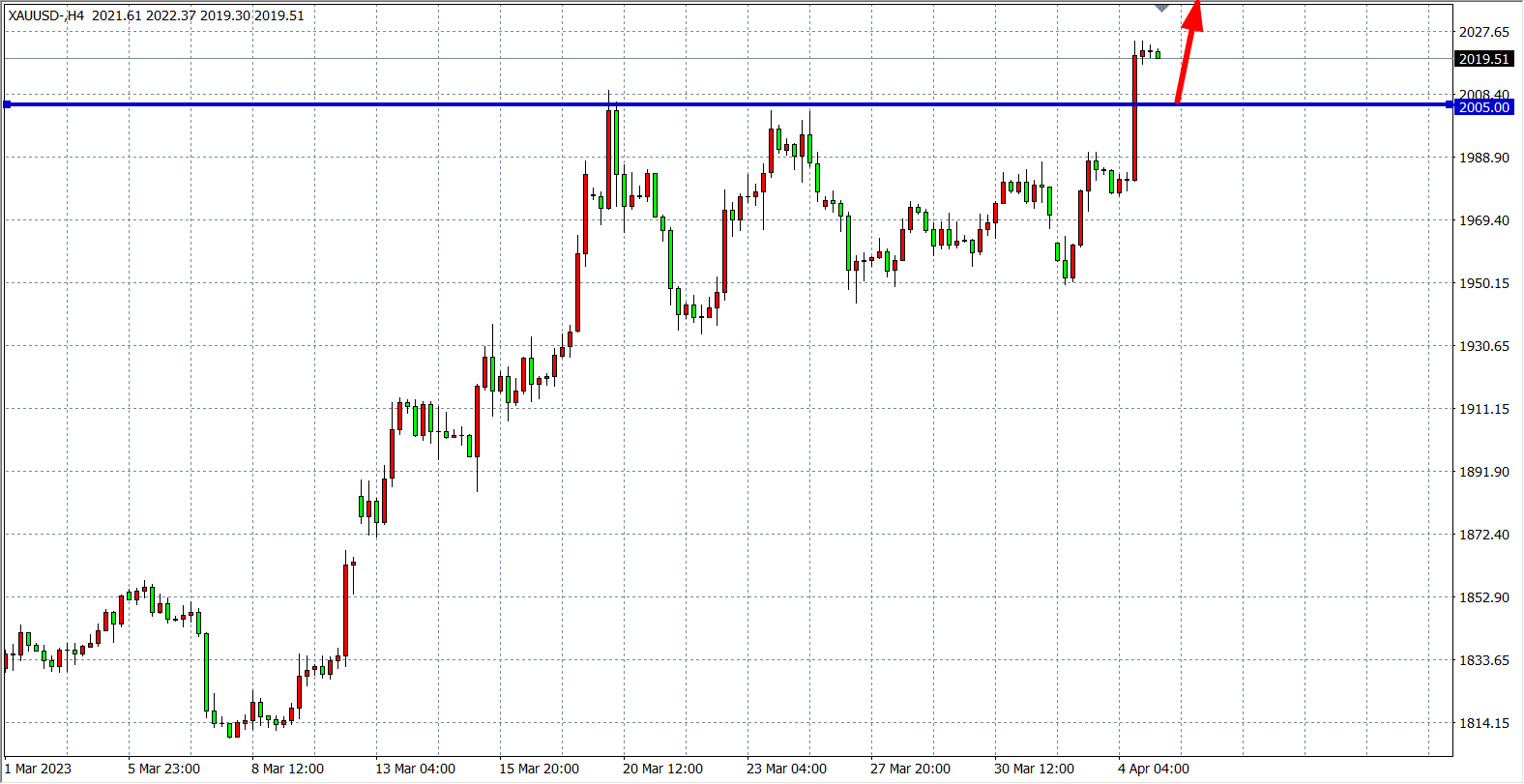 周二(4月4日)美国2月工厂订单月率录得-0.7%,低于预期的-0.5%和前值的-1.6%。同时公布的美国2月JOLTs职位空缺数据自2021年5月以来首次低于1000万人。爆冷的经济数据或削弱美联储进一步加息的必要性,美指下挫至两个月低点,现货黄金一飞冲天,日内较低点涨近50美元,并站上2020美元上方,最终收涨1.81%。展望后市,金价的上涨已成定势,基本面环境未变前,上涨仍是主旋律。