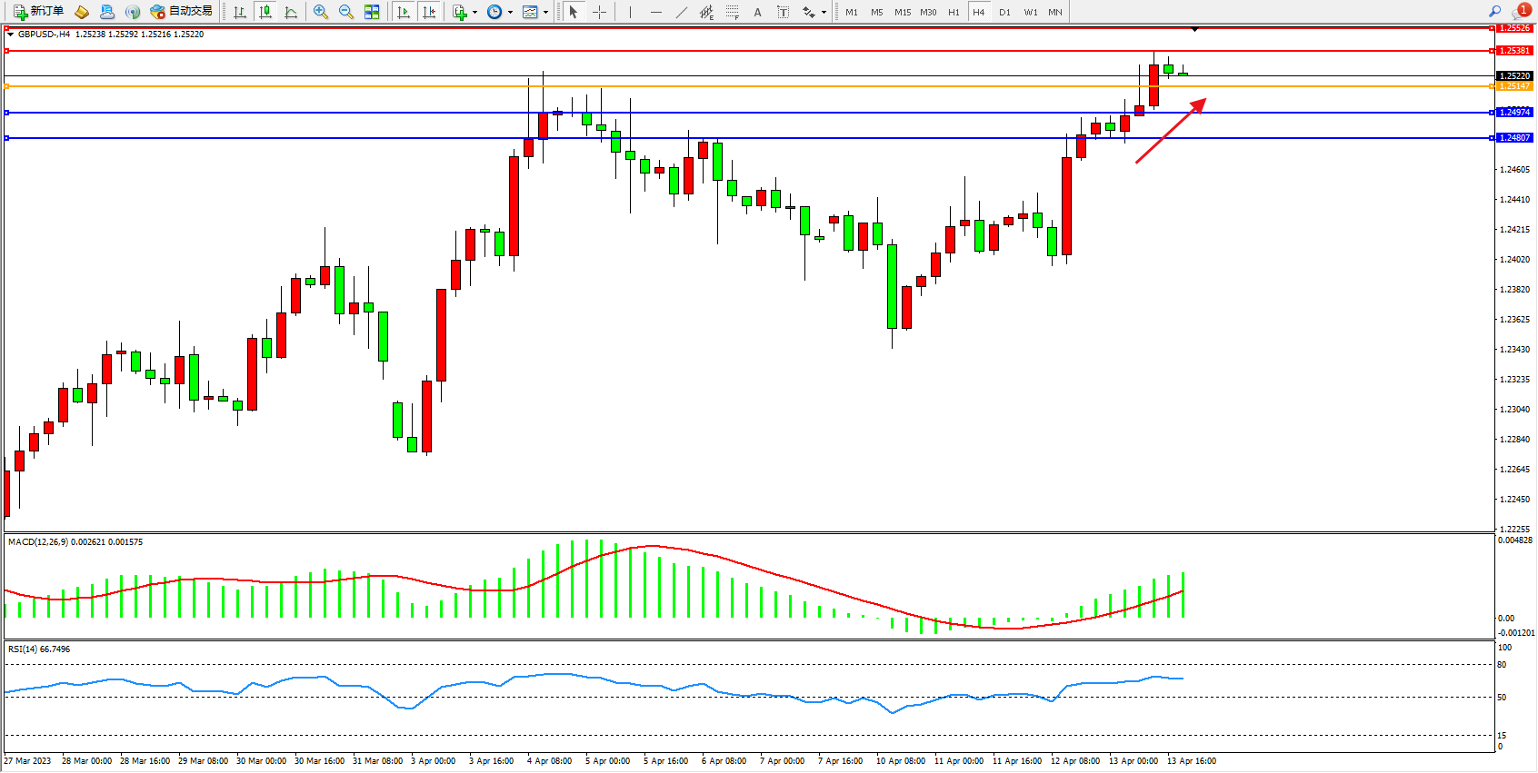 4小时图看:高位不断攀升,市场多头不断向上移动,短期看涨情绪依旧,MACD指标处于多头区域不断上扬,RSI指标处于多头区域高位徘徊;