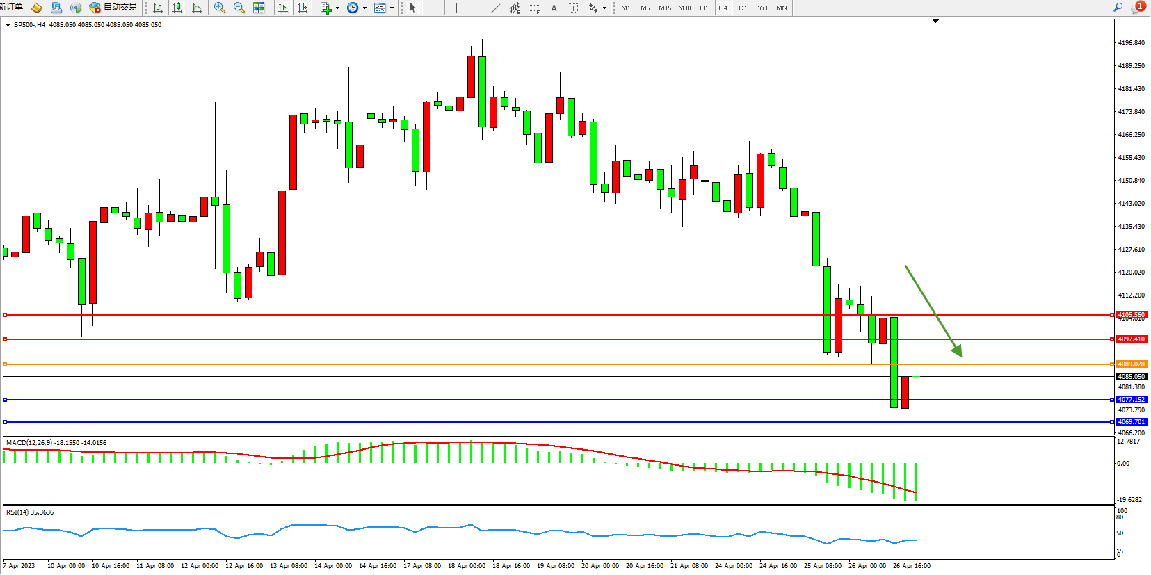 标普500指数4月26日(周三)收盘下跌15.82点,跌幅0.39%,报4055.81点;受商用飞机订单激增的推动,美国3月耐用品订单环比初值跃升了3.2%,远超预期的0.7%。不过,美国3月扣除飞机非国防资本耐用品订单环比初值下降0.4%,为连续第二个月下降且降幅超预期,这表明更高的借贷成本和不明朗的经济前景正在抑制资本投资。