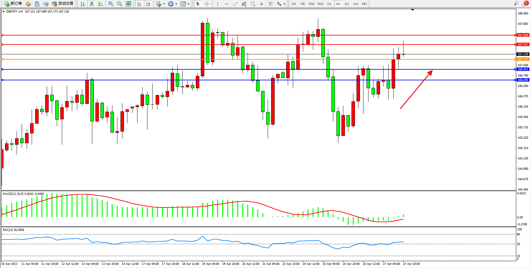 4小时图看:多头动力维持震荡向上移动,短期看涨情绪涌现,市场多头趋势持续,MACD指标处于0轴线上側徘徊,RSI指标处于50均衡线上方弱势整理;