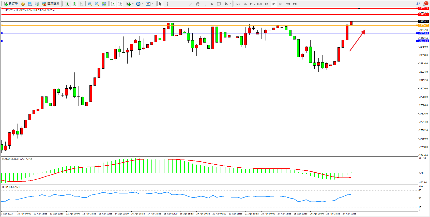 日经225指数4月27日(周四)收盘上涨28.03点,涨幅0.10%,报28444.50点。日本央行前副行长若田部昌澄称,如果日本央行在本周五调整收益率曲线控制(YCC),将会感到意外。日本央行此次有可能改变前瞻指引。
