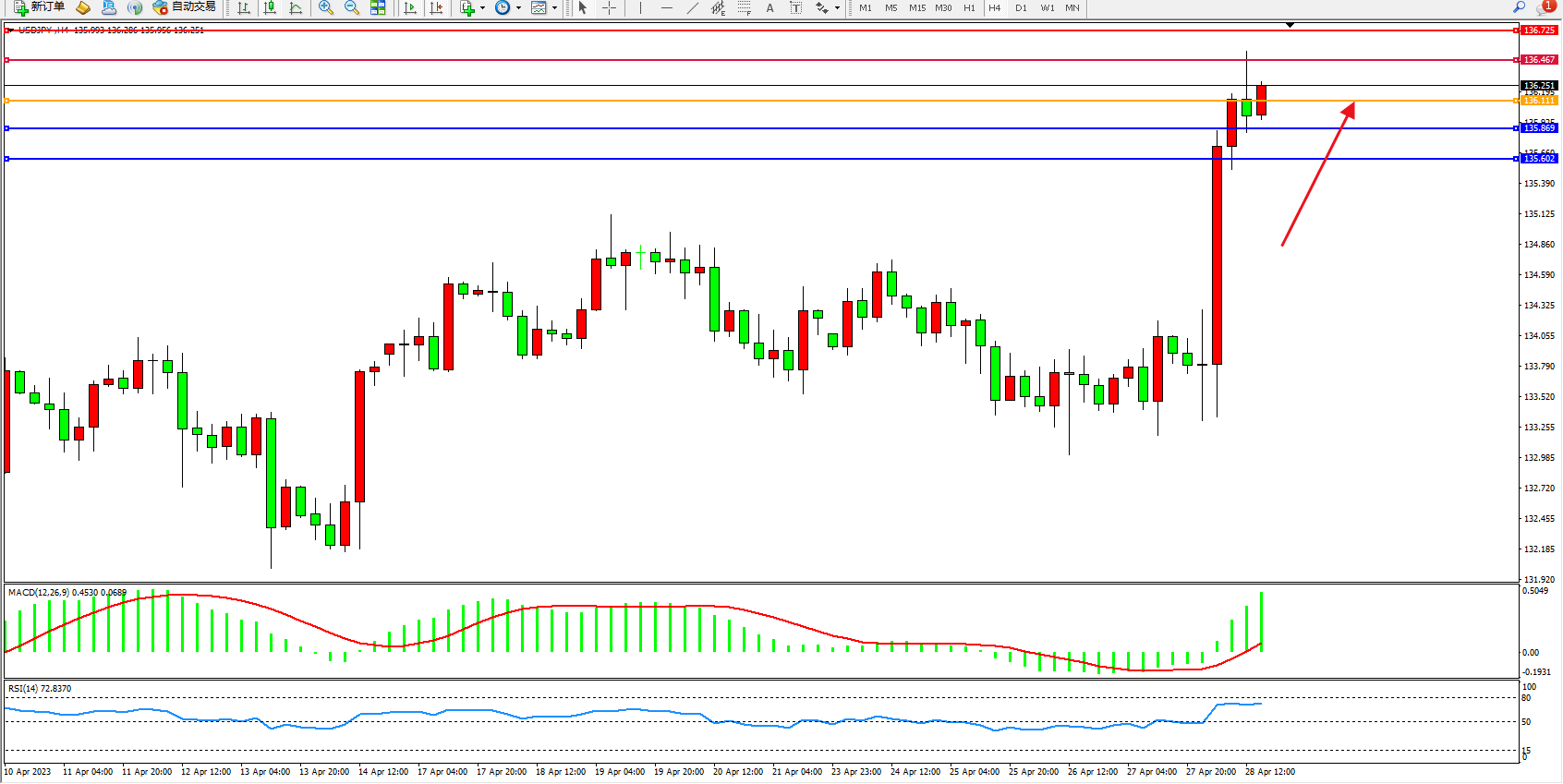 4小时图看:多头动力强势拉升上扬,短期多头情绪笼罩,市场尚未有止步迹象,MACD指标处于多头区域不断上扬,RSI指标处于多头区域高位整理;