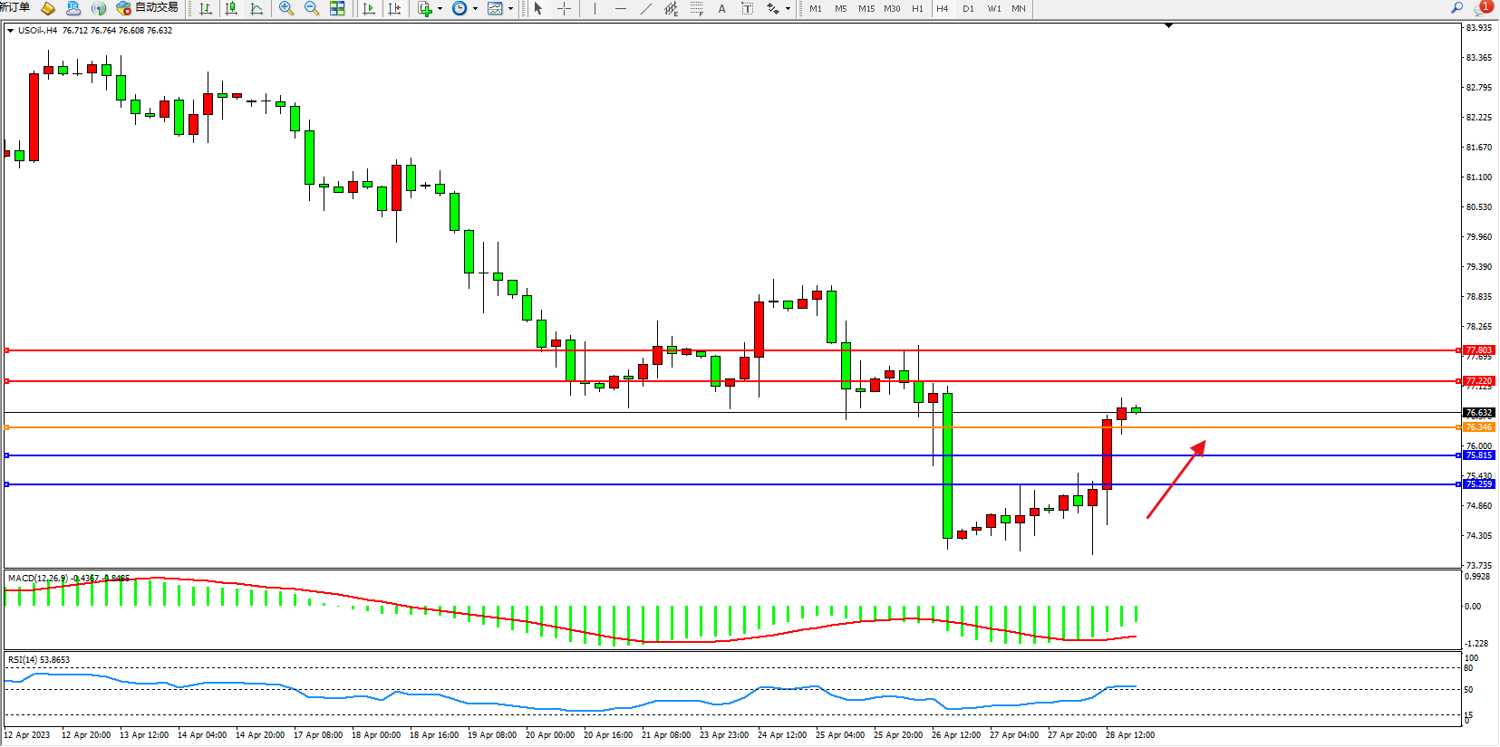原油维持76.632附近震荡,由于市场担心加息可能会减少需求,原油价格在最近几周和几个月都有所下降。