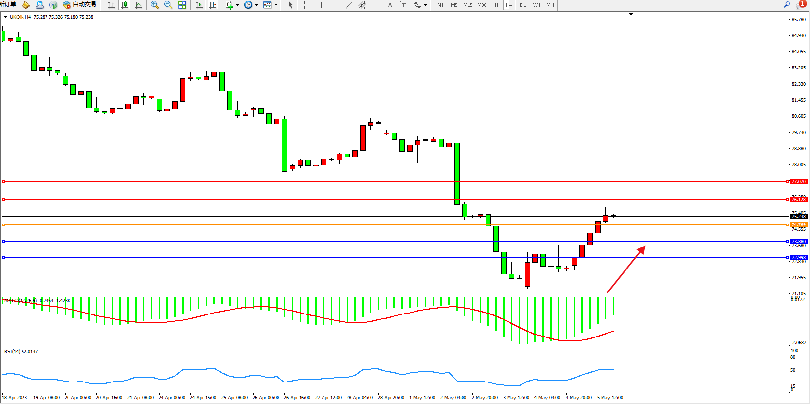 4小时图看:低位多头动力维持震荡上移,短期多头情绪涌现,市场不断拉升中,MACD指标处于空头区域震荡上移,RSI指标处于50均衡线附近弱势徘徊;