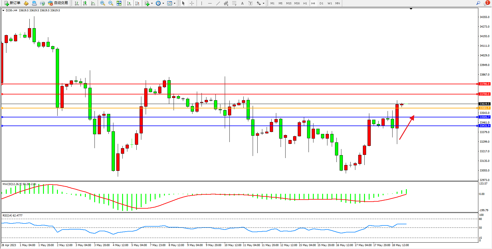道琼斯指数5月18日(周四)收盘上涨115.20点,涨幅0.34%,报33535.97点;美国劳工部周四公布的数据显示,截至5月13日当周,初请失业金人数减少2.2万人,至24.2万人。美国初请失业金人数创下了自2021年以来的最大降幅。