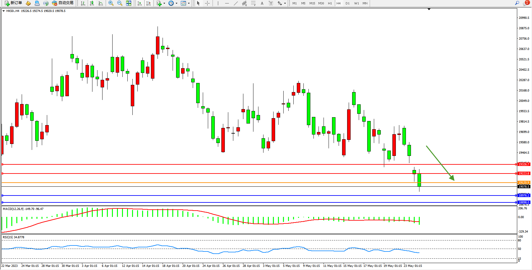 香港恒生指数5月24日(周三)收盘下跌315.32点,跌幅1.62%,报19115.93点;港股午后跌幅加大,恒指跌1.62%下挫超300点,且创2个月新低,恒生科技指数、国指分别跌1.99%和1.9%。大型科技股全天表现萎靡拖累大市下行,人民币疲软,中资大金融股普遍弱势,澳门疫情再起,濠赌股下挫,南下资金全日净流出17.64亿港元,大市成交额为979亿港元。