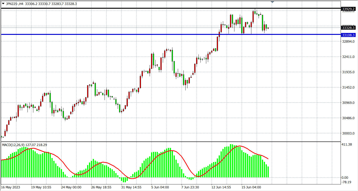 4小时图看,日经指数在33900一线受阻回落,MACD量能在零轴上持续缩量,行情进入高位盘整,当前支撑关注33100附近,阻力关注33900附近,箱体操作为主。