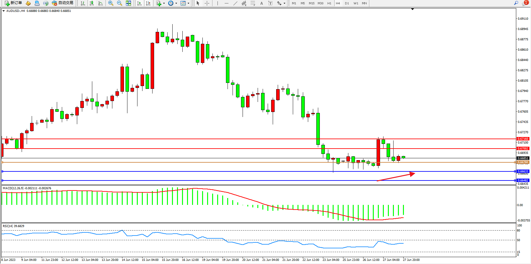 交易策略:0.66780上方看涨,目标0.67002  0.67160