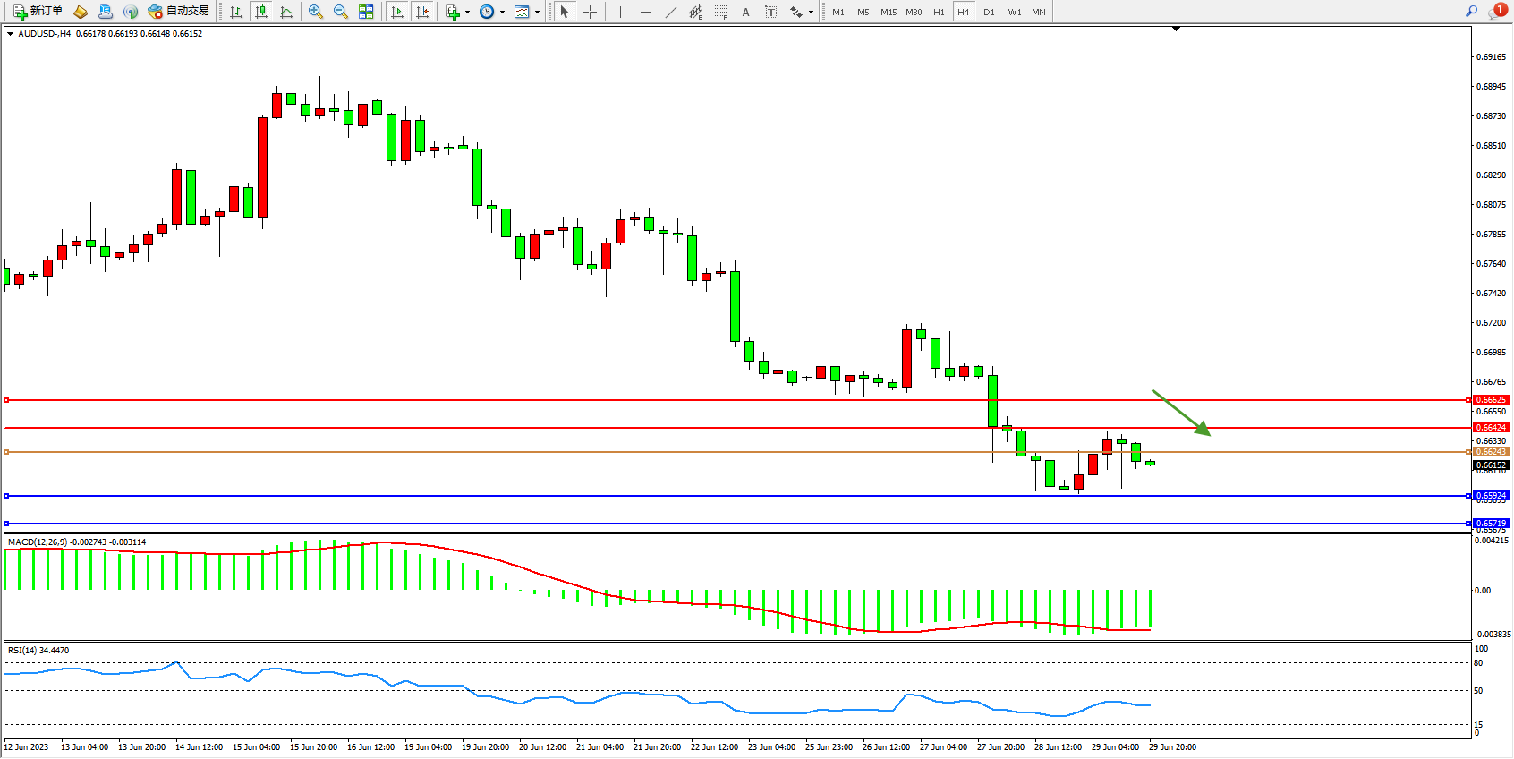 澳元兑美元维持0.66152附近震荡,考虑到近期强劲的劳动力市场数据、居高不下的通胀以及消费者仍在支出的事实,预测面临的风险仍然是澳洲联储可能会在7月份加息25个基点,然后在8月再加息25个基点。