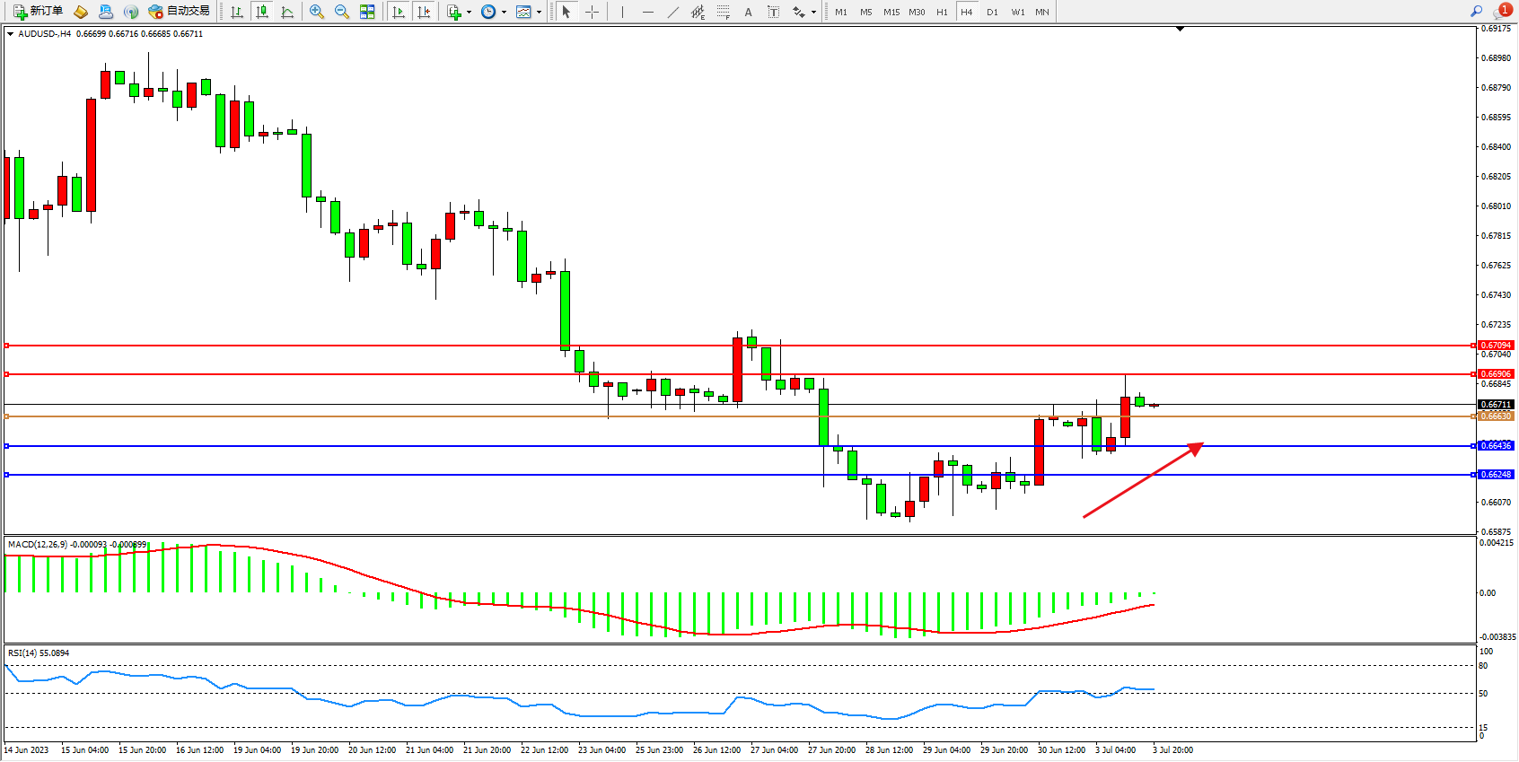 交易策略:0.66630上方看涨,目标0.66906  0.67094