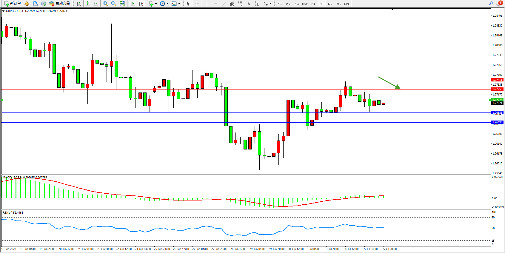 交易策略:1.27074下方看跌,目标1.26859  1.26698