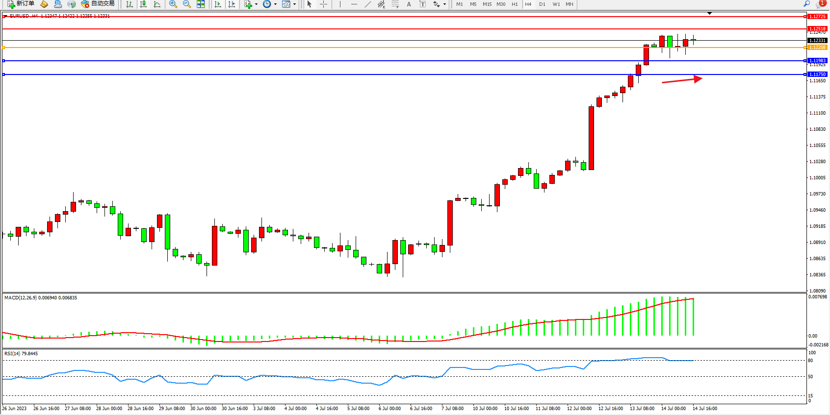 4小时图看:多头动力强势震荡上移后整理,短期高位弱势徘徊,市场看涨情绪依旧,MACD指标处于多头区域高位整理,RSI指标处于多头区域高位超买区80均衡线附近徘徊;
