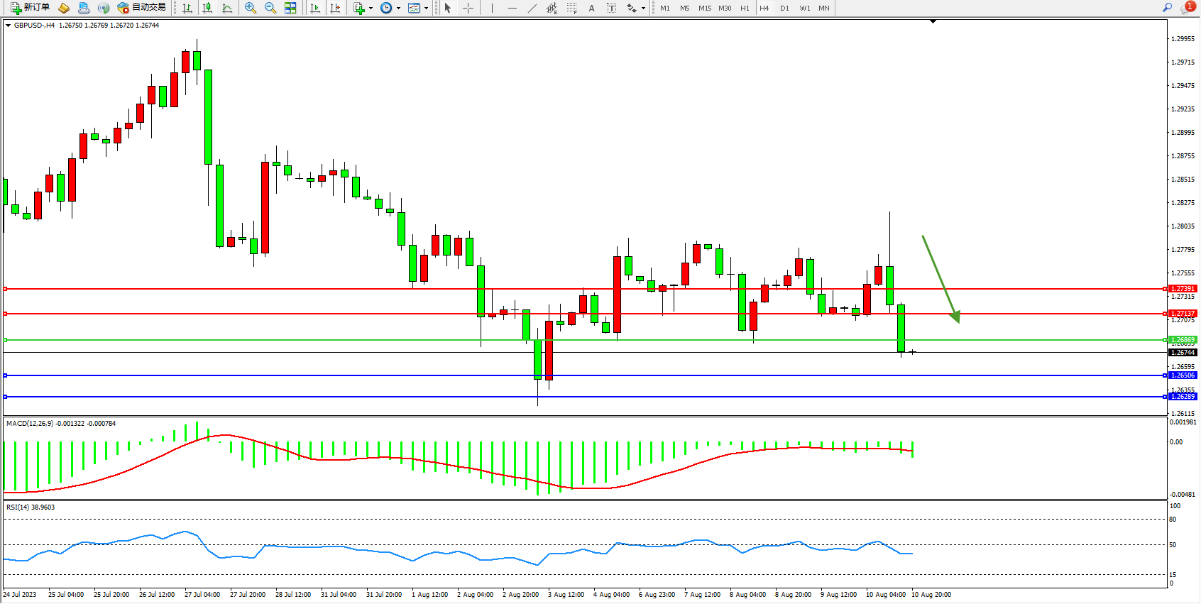 4小时图看:空头动力急速下挫,短期跌势或将延续,市场整体偏空头不断下行,MACD指标处于0轴线下侧弱势整理,RSI指标处于50均衡线下侧弱势徘徊;