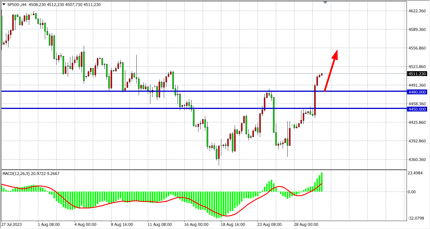 4小时图看,标普进一步走强上破前高点4480附近,MACD量能在零轴上继续放大,行情延续多头,支撑关注4480附近,上方阻力看4540-4580。