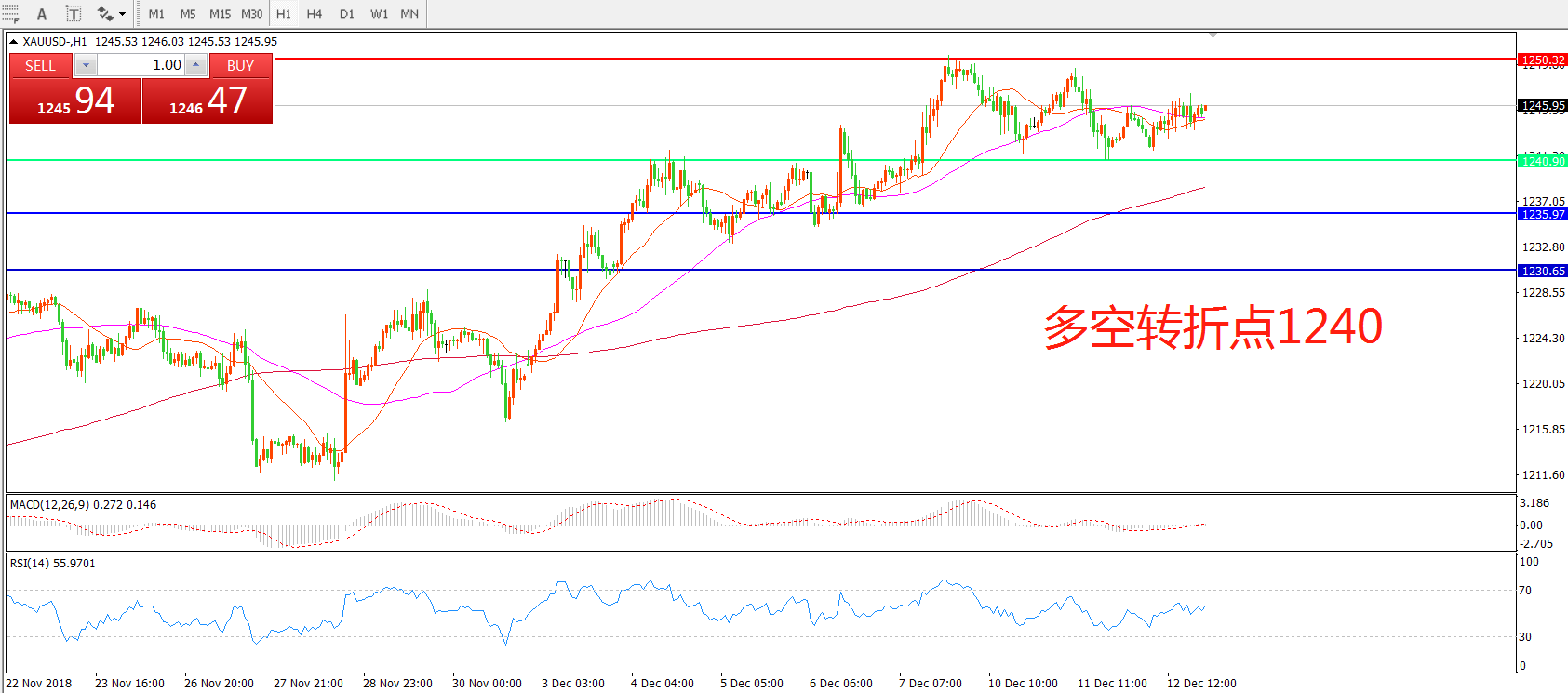 现货黄金周三(12月12日)小幅上涨,盘中最高上探至1246.79后下落,有转入盘整的迹象,但整体仍运行在1240一线上方。美国经济数据11月消费者物价指数CPI与10月持平,保持不变;剔除食品及能源价格的核心通胀率为上涨0.2%,与10月一致,年率为2.2%,符合市场预期。数据公布后,美元转跌,黄金受到一定的支撑。再次强调本周有两个因素在支持贵金属市场,包括英国退欧动荡和美中贸易谈判,目前英国保守党议员不信任投票中,梅获得的支持票超过159票的多数票门槛,赢得党内信任,风险情绪有所缓和,但黄金在12月继续保持乐观。