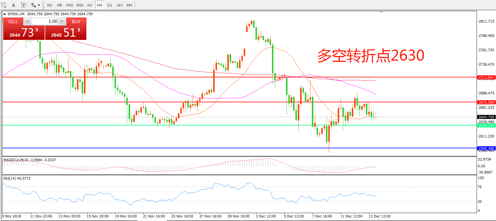 4小时图看,标普500触碰2670阻力后震荡回落,整体价格依然位于均线系统之下, MACD绿柱缩短,短期震荡整理的概率较大。