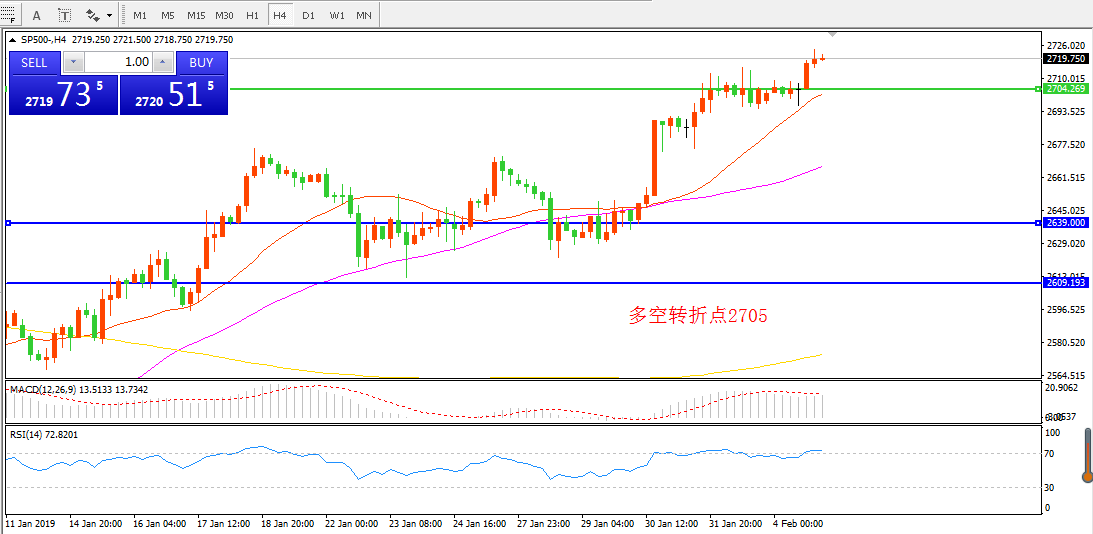4小时图看,SP500在短期整理后延续上行,均线逐渐走高,MACD红柱有回落继续,短期内延续多头思路。