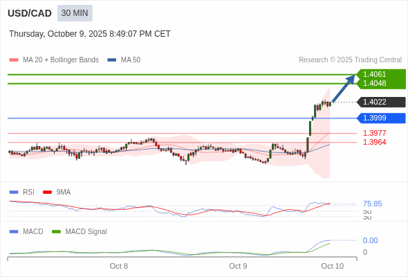技术点评: RSI技术指标大于70。在这种情况下,说明有很强的上升趋势,或者意味着处在超买的状态下,可能会有向下的调整。我们将观察RSI技术指标是否出现背离现象。 MACD技术指标处在其信号线之上看多。 配置为正。 此外,价位高于其20天及50天移动平均线 ( 分别位于1.3980 和1.3962 )。