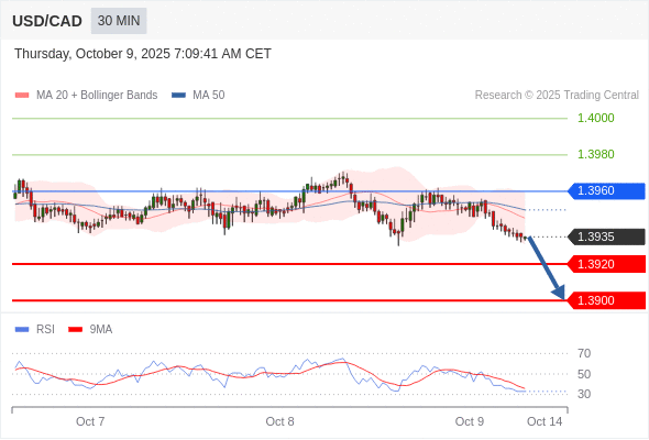 在 1.3960 之下,看跌,目标价位为 1.3920 ,然后为 1.3900 。