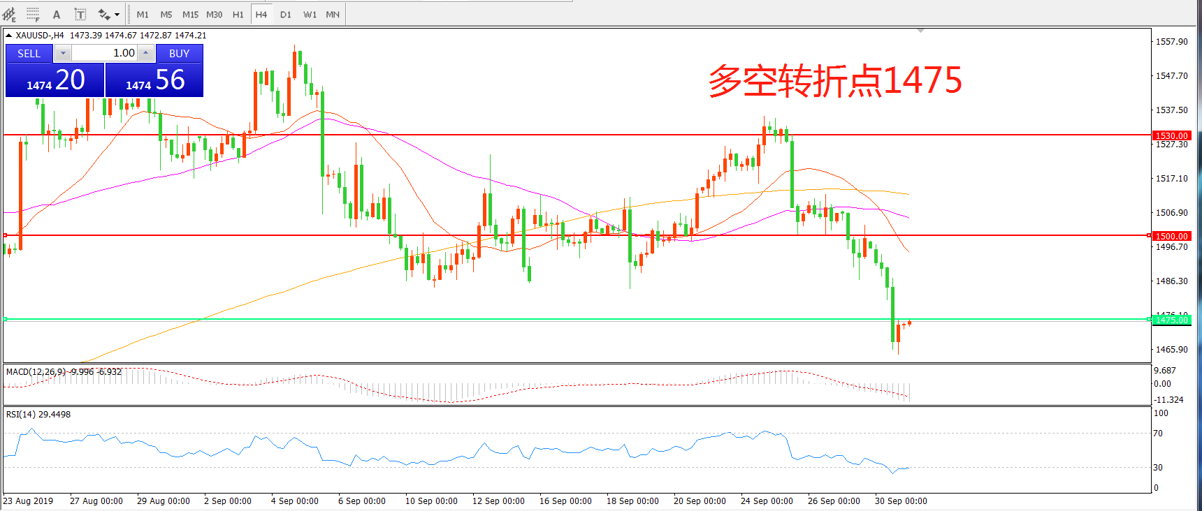 周一(9月30日),全球贸易局势的缓和和美元走强给金价带来巨大压力,美盘中时段,现货黄金遭到猛烈抛售,连失1480和1470美元/盎司关口,短线急跌约20美元,最终收报1472.70美元/盎司。本周需要密切关注周五美国非农就业报告给金价后市走势带来的指引。