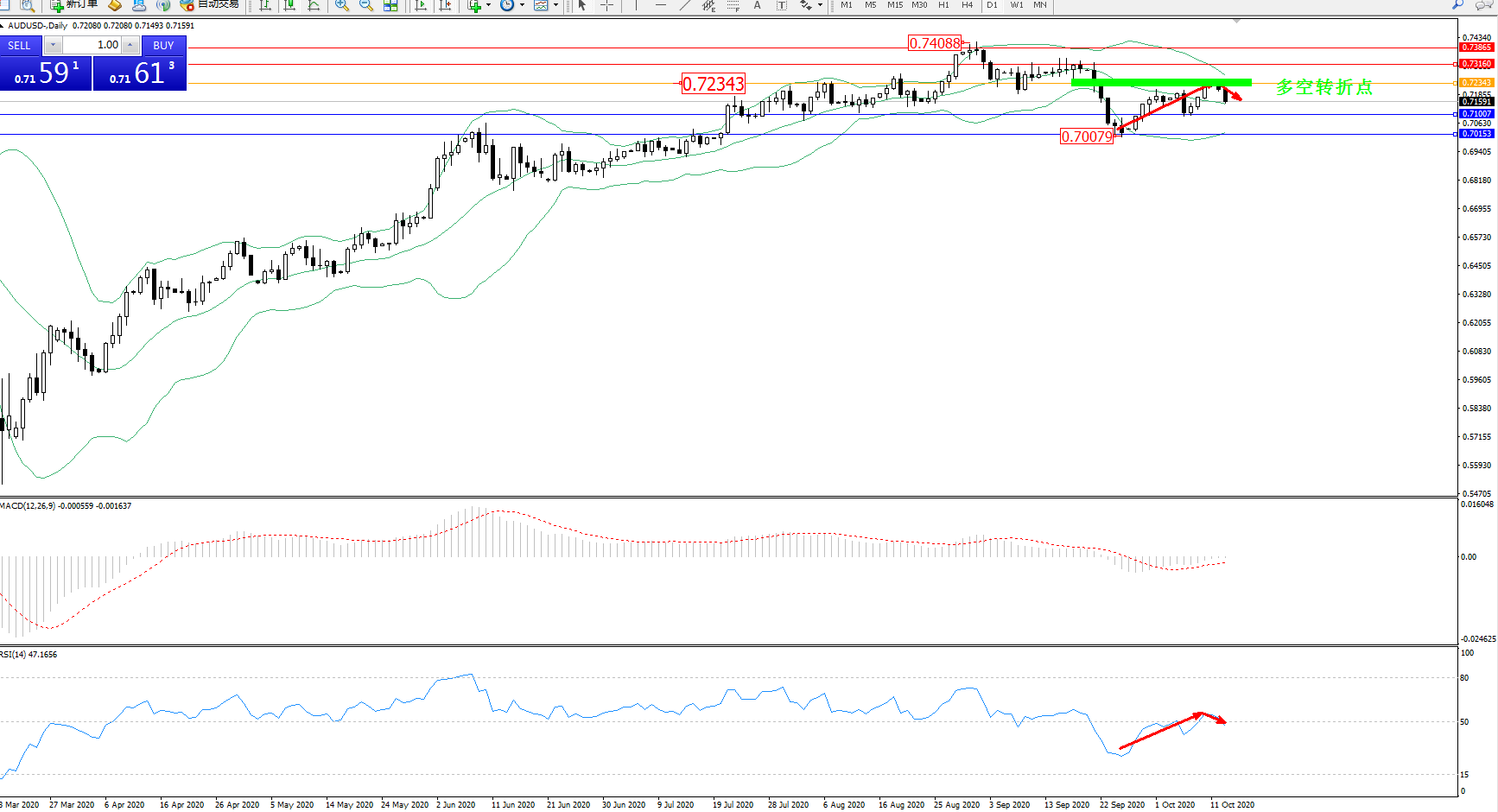 技术点评:高位空头点弱势震荡回撤至0.70079位置后得到短暂支撑开始缓慢上移,弱势震荡至中上轨区间徘徊,布林带指标呈收口走势中,有再度下破中轨迹象,关注上轨附近转折点,MACD指标处于空头区域低位弱势上移至0轴线附近徘徊,RSI指标低位多头动力持续震荡回升至50均衡线附近徘徊中;