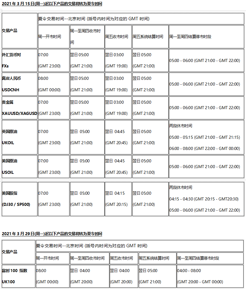 因应北美时区将于2021年3月14日(周日)及欧洲时区将于2021年3月28日(周日)分别开始转入夏令时间, 以下欧美市场各产品交易时间将调整为夏令时交易时间,敬请阁下留意知悉!