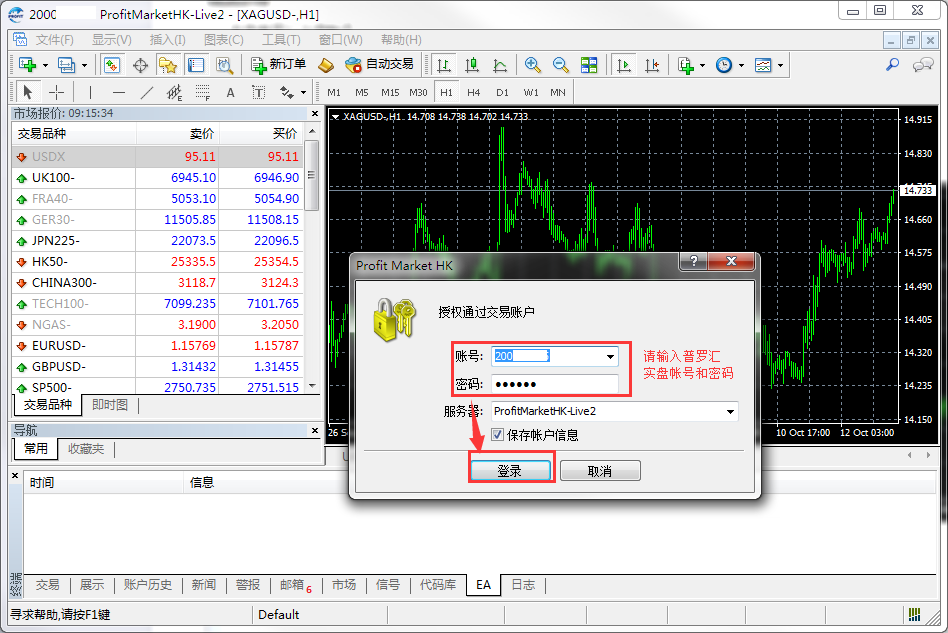 注:登录实盘帐号要选择服务器ProfitMarketHK-Live2登录